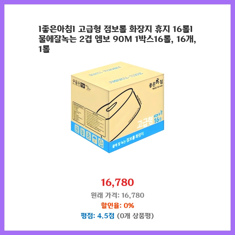 I좋은아침I 고급형 점보롤 화장지 휴지 16롤I 물에잘녹는 2겹 엠보 90M 1박스16롤, 16개, 1롤