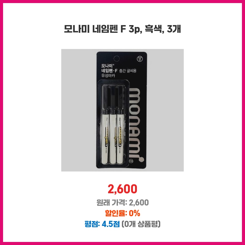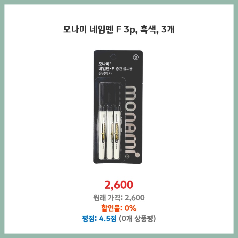 깔끔한 필기감과 오랫동안 사용할 수 있는 내구성으로 유명한 모나미 네임펜이라 구매했습니다. 3개들이라 가성비도 좋고, 흑색은 어디에든 활용도가 높아서 실용적입니다. 필기감이 부드러워 장시간 사용에도 손이 편안했습니다.