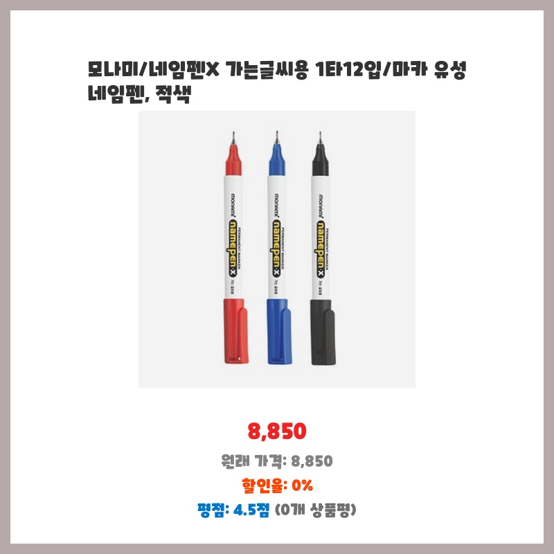 깔끔한 적색과 가는 글씨체가 필요해서 구매했습니다. 모나미 네임펜이라 품질에 대한 믿음이 있었고, 12개들이라 여러 용도로 사용하기에 경제적이라고 생각했습니다. 유성이라 번짐 없이 선명하게 적히는 점도 마음에 들었습니다.