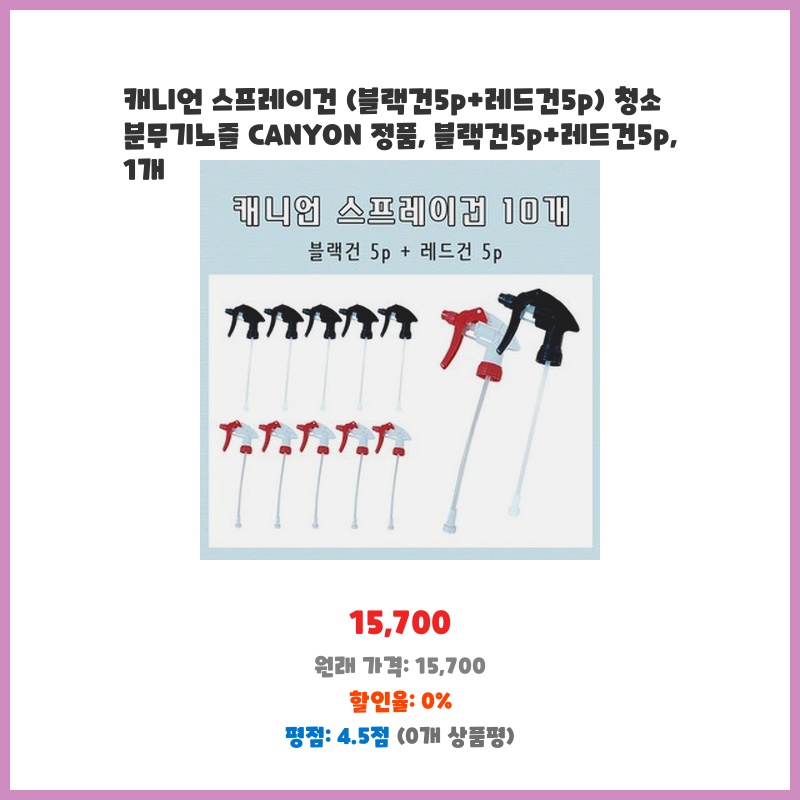 캐니언 정품 스프레이건이라 믿을 수 있고, 블랙과 레드 색상이 각 5개씩 구성되어 다양한 용도로 활용 가능해서 구매했습니다. 분사력도 괜찮고, 여러 개 있어서 부족함 없이 사용할 수 있을 것 같아요.