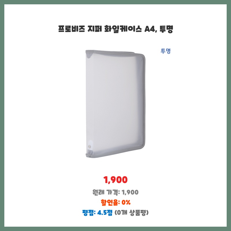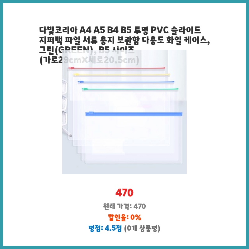 중요한 서류나 용지를 투명하게 보관하고 싶어서 구매했습니다. A5 사이즈라 휴대하기에도 편리하고, 지퍼백이라 내용물이 분실될 걱정 없어 좋습니다. PVC 소재라 튼튼하고, 가격도 저렴해서 부담없이 사용할 수 있습니다.