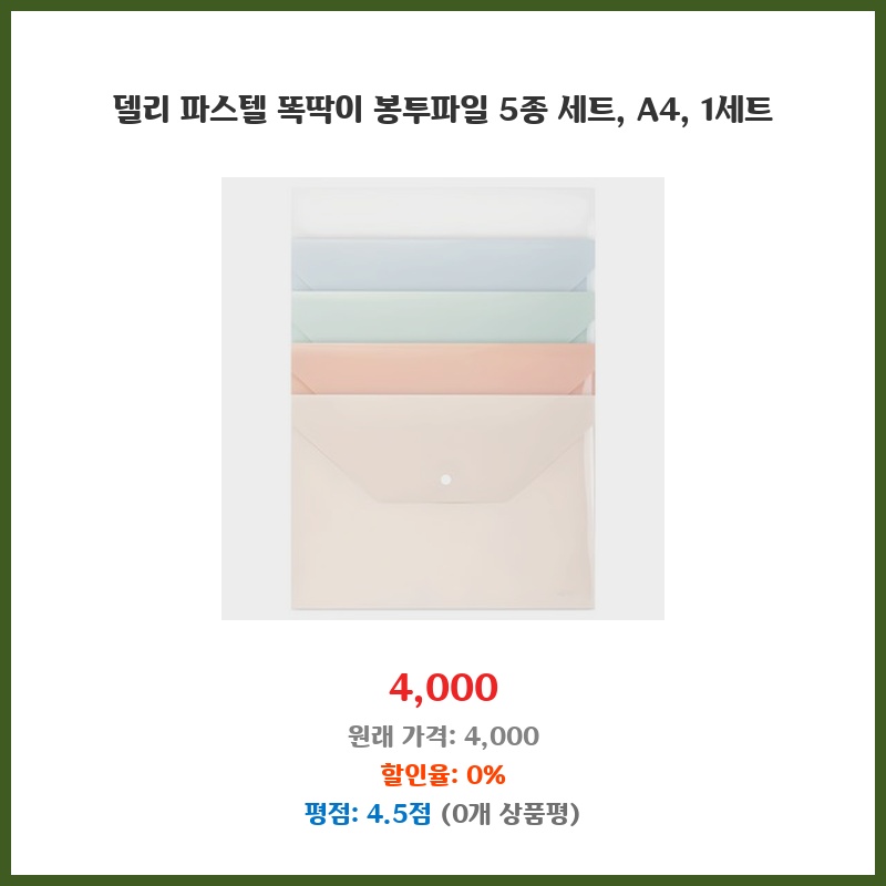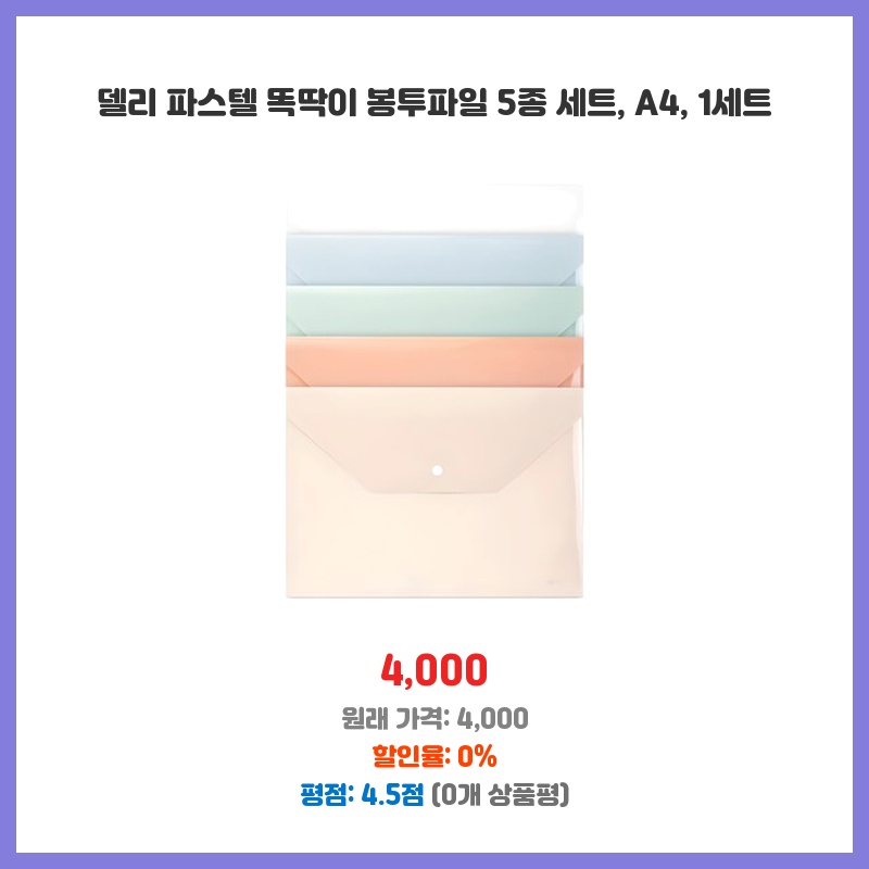A4 사이즈라 서류 정리에 편리하고, 5가지 색상으로 용도별 분류가 용이해 보여 구매했습니다. 똑딱이 방식이라 사용이 간편하고, 파스텔톤 색상이 보기에도 좋습니다. 가격도 저렴해서 부담 없었습니다.